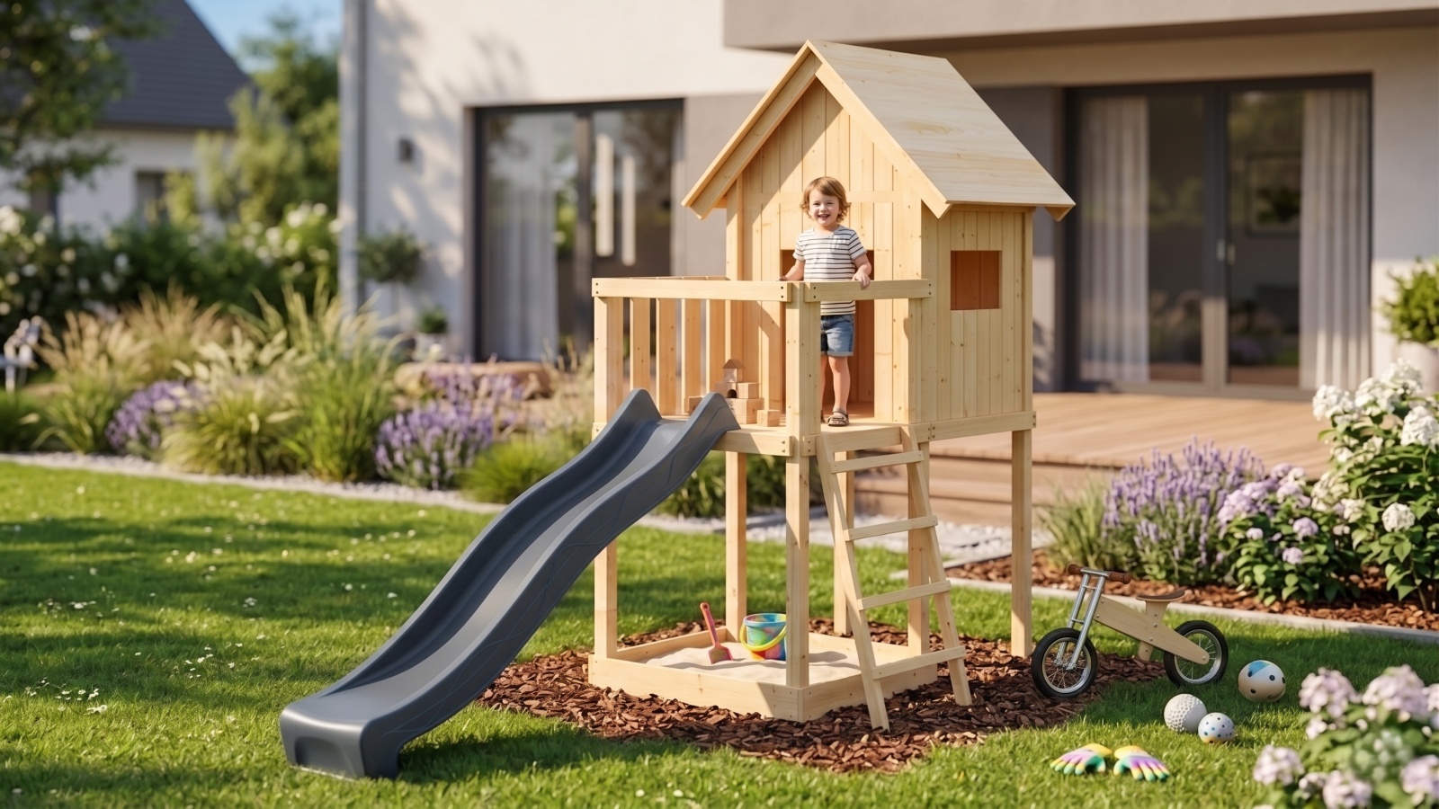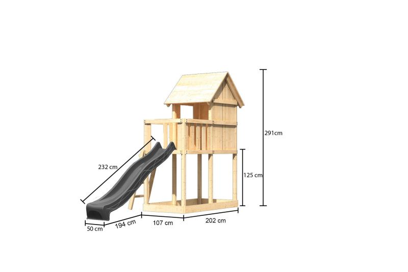 Dětské hřiště KARIBU FRIEDA poskytuje dětem spoustu možností ke hrám. Nabízí vše k tomu, aby děti mohly prožít veškeré své hrací fantazie. Stejně jako u všech našich dětských hřišť i u modelu KARIBU FRIEDA používáme výhradně to nejlepší přírodní smrkové dřevo. Hřiště má nosné sloupy o tloušťce 68 x 68 mm, stěny a podlahu z dřevěných profilů o síle 18 mm (systém pero / drážka). Terasa s domkem se nachází ve výšce 125 cm. Naše dřevo pochází ze vzdáleného severu Evropy a je chemicky naprosto neošetřené. V důsledku toho je prosté všech známých problematických látek. Díky výšce plošiny nabízí hřiště KARIBU FRIEDA dětem dokonalý výhled na zahradu. Sedlová střecha je vyrobena z dřevotřískových desek. Hřiště je standardně vybaveno robustním dřevěným žebříkem se 4 příčkami a pískovištěm pod věží. I tento výrobek má samozřejmě certifikát TÜV Nord ověřující bezpečnost výrobku (GS) podle DIN EN 71-1, DIN EN 71-3, DIN EN 71-8 a AfPS GS 2014.
