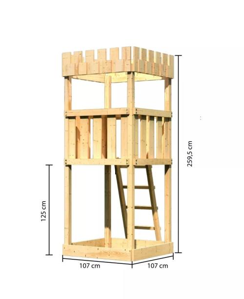 Dětské hřiště KARIBU LÖWENHERZ poskytuje dětem spoustu možností ke hrám. Nabízí vše k tomu, aby děti mohly prožít veškeré své hrací fantazie. Stejně jako u všech našich dětských hřišť i u modelu KARIBU LÖWENHERZ používáme výhradně to nejlepší smrkové dřevo. Hřiště má nosné sloupy o tloušťce 68 x 68 mm a je vyrobené z dřevěných profilů o síle 18 mm (spoje v systému pero / drážka). Naše dřevo pochází ze vzdáleného severu Evropy a je chemicky naprosto neošetřené. V důsledku toho je prosté všech známých problematických látek. Díky výšce plošiny 125 cm nabízí hřiště KARIBU LÖWENHERZ dětem dokonalý výhled na zahradu. Hřiště je standardně vybaveno robustním dřevěným žebříkem se 4 příčkami a pískovištěm pod věží. Dětské hřiště KARIBU LÖWENHERZ má samozřejmě certifikát TÜV Nord ověřující bezpečnost výrobku (GS) podle DIN EN 71-1, DIN EN 71-3, DIN EN 71-8 a AfPS GS 2014.