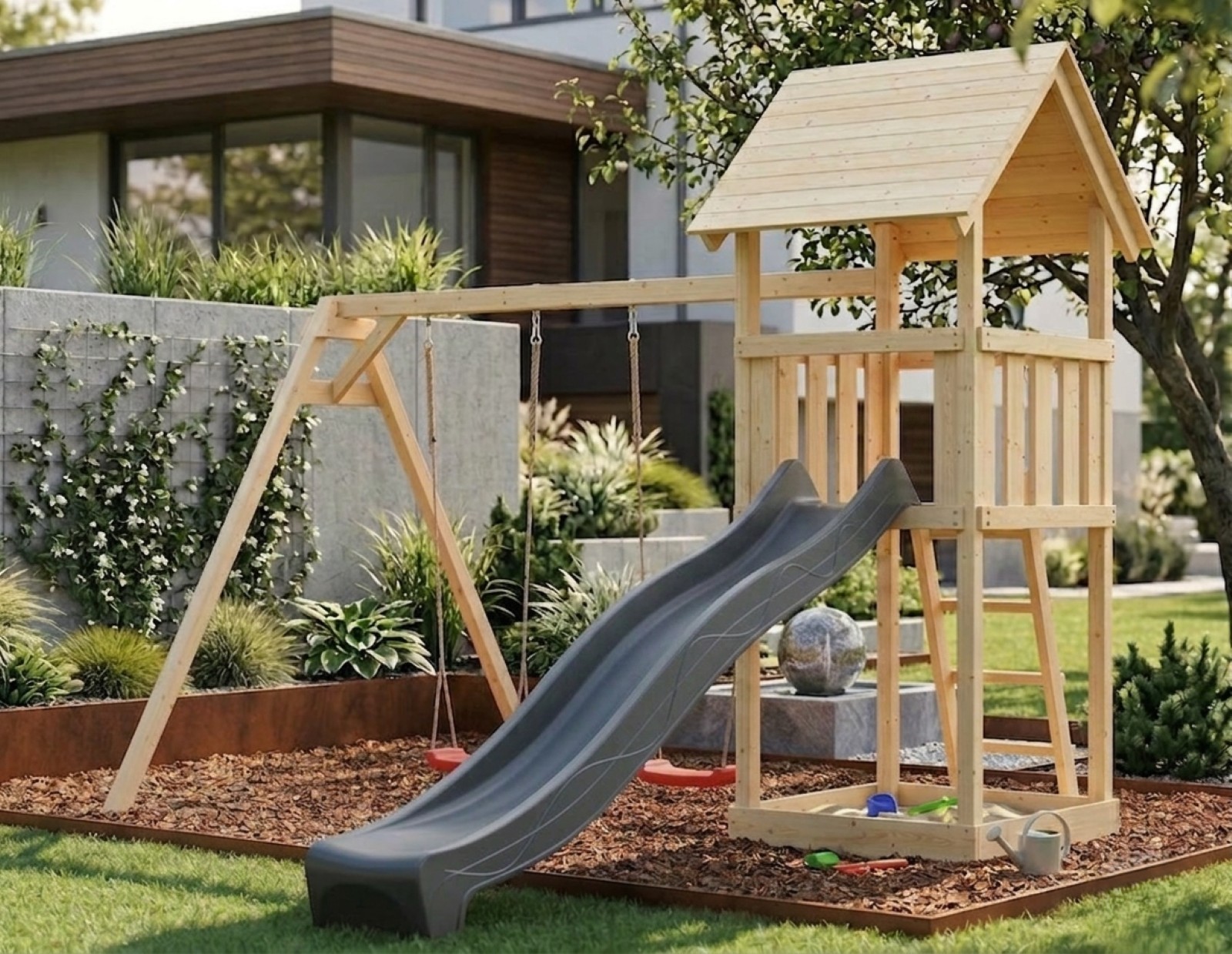 - dvousedadlová houpačka včetně závěsů a dvou červených sedátek