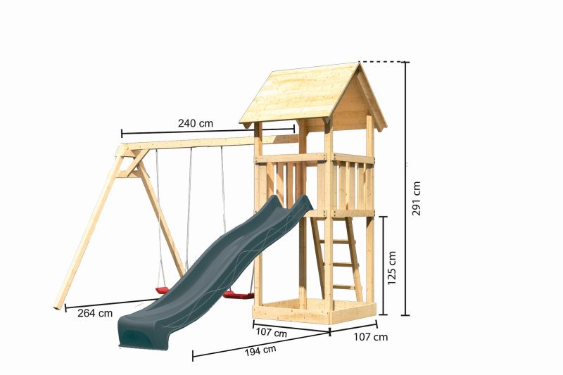 Dětské hřiště KARIBU LOTTI poskytuje dětem spoustu možností ke hrám. Nabízí vše k tomu, aby děti mohly prožít veškeré své hrací fantazie. Stejně jako u všech našich dětských hřišť i u modelu KARIBU LOTTI používáme výhradně to nejlepší smrkové dřevo. Hřiště má nosné sloupy o tloušťce 68 x 68 mm a je vyrobené z dřevěných profilů o síle 18 mm (spoje v systému pero / drážka). Naše dřevo pochází ze vzdáleného severu Evropy a je chemicky naprosto neošetřené. V důsledku toho je prosté všech známých problematických látek. Díky výšce plošiny 125 cm nabízí hřiště KARIBU LOTTI dětem dokonalý výhled na zahradu. Hřiště je standardně vybaveno robustním dřevěným žebříkem se 4 příčkami a pískovištěm pod věží. Dětské hřiště KARIBU LOTTI má samozřejmě certifikát TÜV Nord ověřující bezpečnost výrobku (GS) podle DIN EN 71-1, DIN EN 71-3, DIN EN 71-8 a AfPS GS 2014.