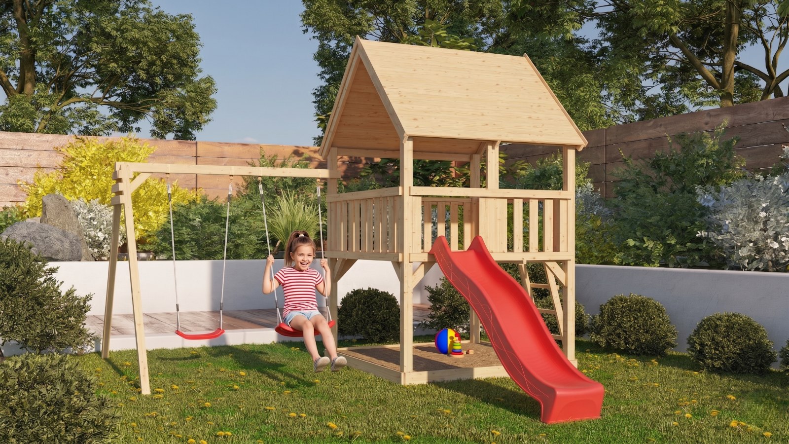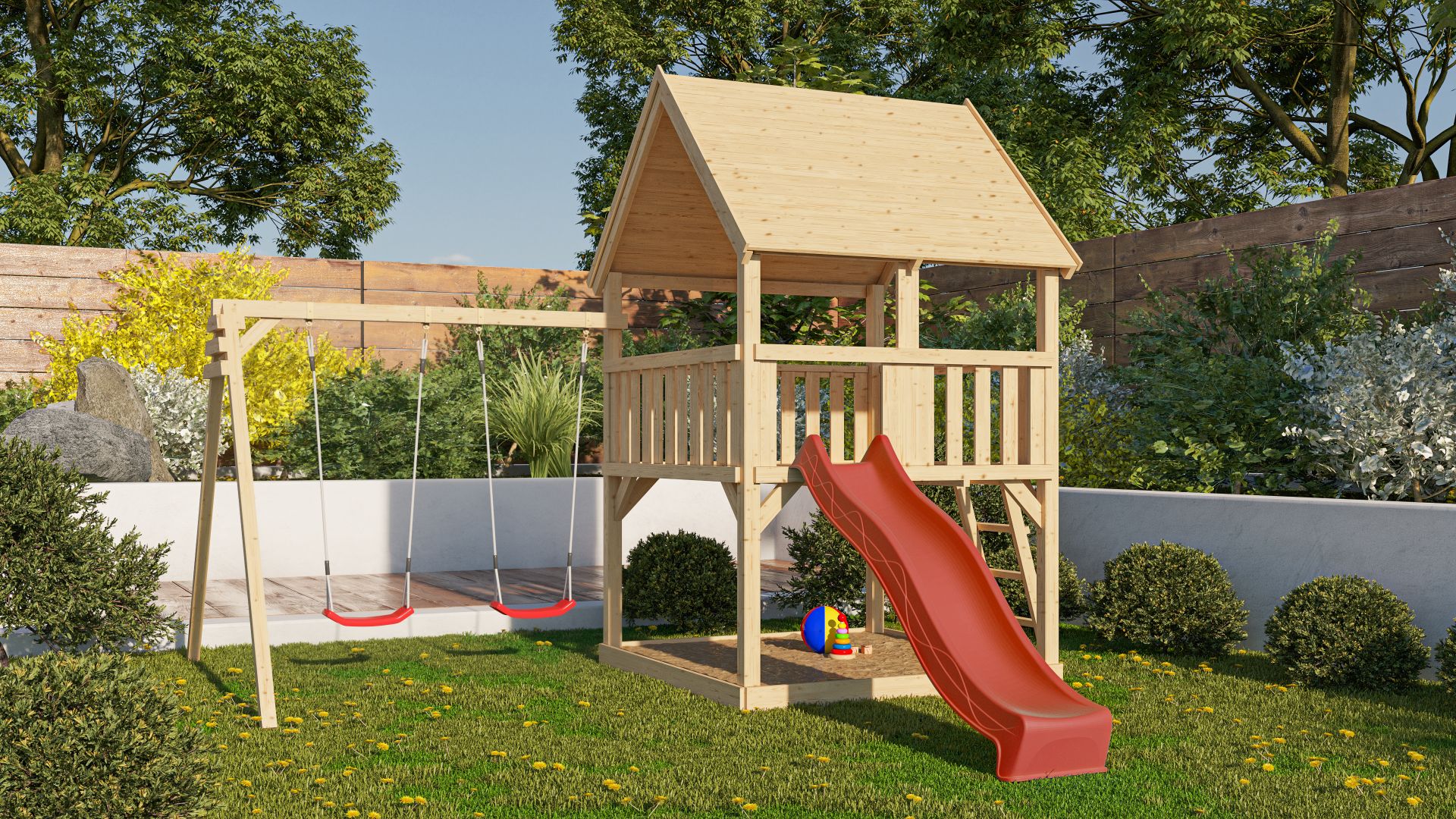 - dvousedadlová houpačka včetně závěsů a dvou červených sedátek