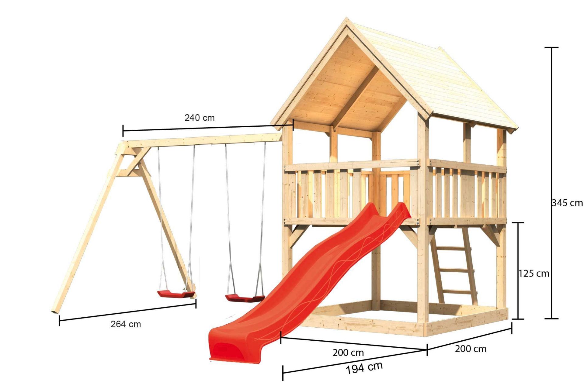 Dětské hřiště KARIBU LUIS poskytuje dětem spoustu možností ke hrám. Nabízí vše k tomu, aby děti mohly prožít veškeré své hrací fantazie. Stejně jako u všech našich dětských hřišť i u modelu KARIBU LUIS používáme výhradně to nejlepší smrkové dřevo. Hřiště má nosné sloupy o tloušťce 90 x 90 mm a je vyrobené z dřevěných profilů o síle 18 mm (spoje v systému pero / drážka). Naše dřevo pochází ze vzdáleného severu Evropy a je chemicky naprosto neošetřené. V důsledku toho je prosté všech známých problematických látek. Díky výšce plošiny 125 cm nabízí hřiště KARIBU LUIS dětem dokonalý výhled na zahradu. Hřiště je standardně vybaveno robustním dřevěným žebříkem se 4 příčkami a pískovištěm pod věží. Dětské hřiště KARIBU LUIS má samozřejmě certifikát TÜV Nord ověřující bezpečnost výrobku (GS) podle DIN EN 71-1, DIN EN 71-3, DIN EN 71-8 a AfPS GS 2014.
