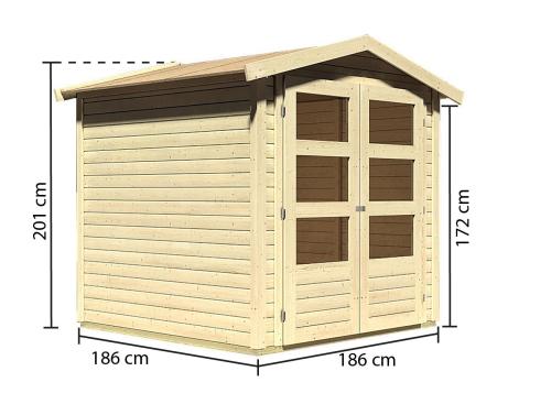 Dřevěný domek, síla stěny 19 mm, rozměry š 186 x d 186 cm, vnější plocha domku 3,46 m2.