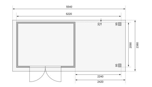 Tato verze domku obsahuje přístavek včetně zadní stěny délky 240 cm montovatelný zprava nebo zleva.