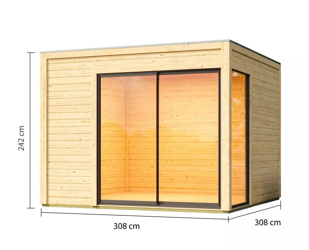 Zahradní domek DICE 1 s moderní plochou střechou představuje kvalitní a stylové řešení pro proměnu vaší zahrady i praktický prostor pro celoroční využití. Robustní konstrukce z masivních dřevěných stěn s dvojitým spojem pero-drážka a vodoodpudivým profilováním zajišťuje vysokou stabilitu, dlouhou životnost a odolnost vůči povětrnostním vlivům. S rozměry 308 × 308 × 242 cm (Š × H × V) nabízí dostatek prostoru. Domek je dodáván v kompletní sadě a lze jej sestavit bez větší námahy.