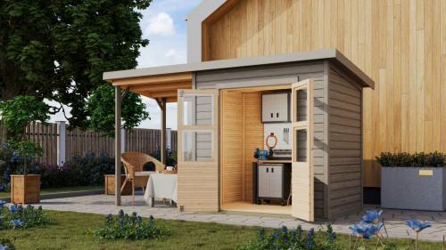 dřevěný domek KARIBU MERSEBURG 3 + přístavek 166 cm (9559) světle šedý