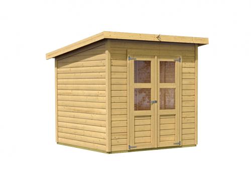 Základní model dřevěného domku pro vaši zahradu. Tento model má pultovou střechu a dvoukřídlé dveře na pantech s oknem v každém křídle. Stavebním materiálem domku jsou dřevěné profily síly 14 mm perfektně vyfrézované ze severského smrku. Dodáváme jako stavebnici v rozloženém stavu, kde stěny tvoří jednotlivé dřevěné profily, které pouze sesadíte k sobě a sešroubujete, střechu tvoří celistvá deska. To garantuje extrémně jednoduchou montáž, kterou zvládne každý český kutil.