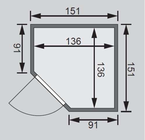 Malá finská sauna určená až pro dvě osoby. Má rozměr š 151 x h 151 x v 198 cm s rohovými dveřmi. Tento model finské sauny je určený do temperovaných interiérů domu nebo bytu. Její výrobce, firma KARIBU HOLZTECHNIK z německých Brém, dokázala svými výrobky úspěšně navázat na staletou tradici skandinávského saunování a současně do ní zapracovat dnešní moderní technologie. Sauna je celá vyrobena ze dřeva severského smrku v přírodním provedení. Dřevo pochází ze vzdáleného severu Evropy a je chemicky naprosto neošetřené (není ani namořeno ani nalakováno). V důsledku toho je prosté všech známých problematických látek, které by se v průběhu saunování mohly ze dřeva uvolňovat. Tato interiérová sauna vykazuje mimořádné tepelně-izolační vlastnosti. Stěny sauny jsou složeny z vnitřní a vnější vrstvy speciálně hlazených prken s perem a drážkou, mezi kterými je 42 mm silná tepelná izolace v podobě minerální vlny. Celková síla stěny je tak 68 mm. Zadní nebo boční nepohledové strany orientované ke stěně místnosti mají vnější stranu ze sololitu. Proto jsou při stejné tepelné izolaci o cca 10 mm tenčí než pohledové strany pokryté palubkami.