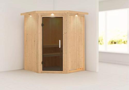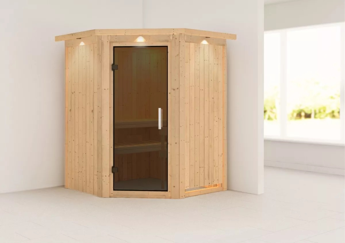 Malá finská sauna určená až pro dvě osoby. Má rozměr š 151 x h 151 x v 198 cm s rohovými dveřmi. Tento model finské sauny je určený do temperovaných interiérů domu nebo bytu. Její výrobce, firma KARIBU HOLZTECHNIK z německých Brém, dokázala svými výrobky úspěšně navázat na staletou tradici skandinávského saunování a současně do ní zapracovat dnešní moderní technologie. Sauna je celá vyrobena ze dřeva severského smrku v přírodním provedení. Dřevo pochází ze vzdáleného severu Evropy a je chemicky naprosto neošetřené (není ani namořeno ani nalakováno). V důsledku toho je prosté všech známých problematických látek, které by se v průběhu saunování mohly ze dřeva uvolňovat. Tato interiérová sauna vykazuje mimořádné tepelně-izolační vlastnosti. Stěny sauny jsou složeny z vnitřní a vnější vrstvy speciálně hlazených prken s perem a drážkou, mezi kterými je 42 mm silná tepelná izolace v podobě minerální vlny. Celková síla stěny je tak 68 mm. Zadní nebo boční nepohledové strany orientované ke stěně místnosti mají vnější stranu ze sololitu. Proto jsou při stejné tepelné izolaci o cca 10 mm tenčí než pohledové strany pokryté palubkami.