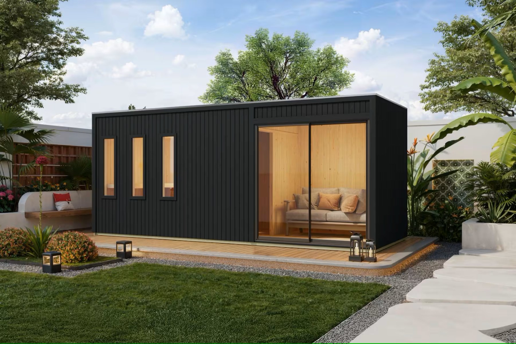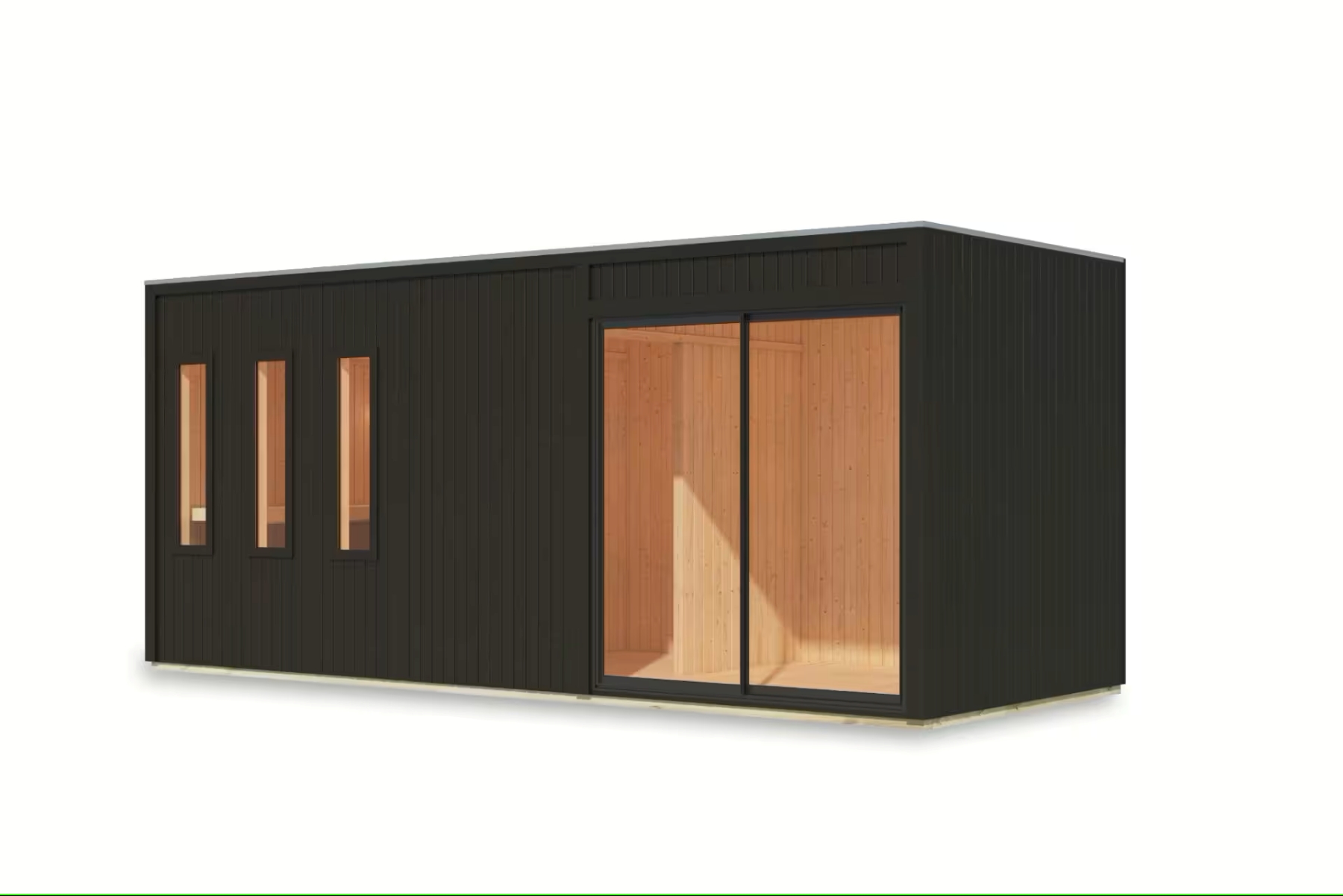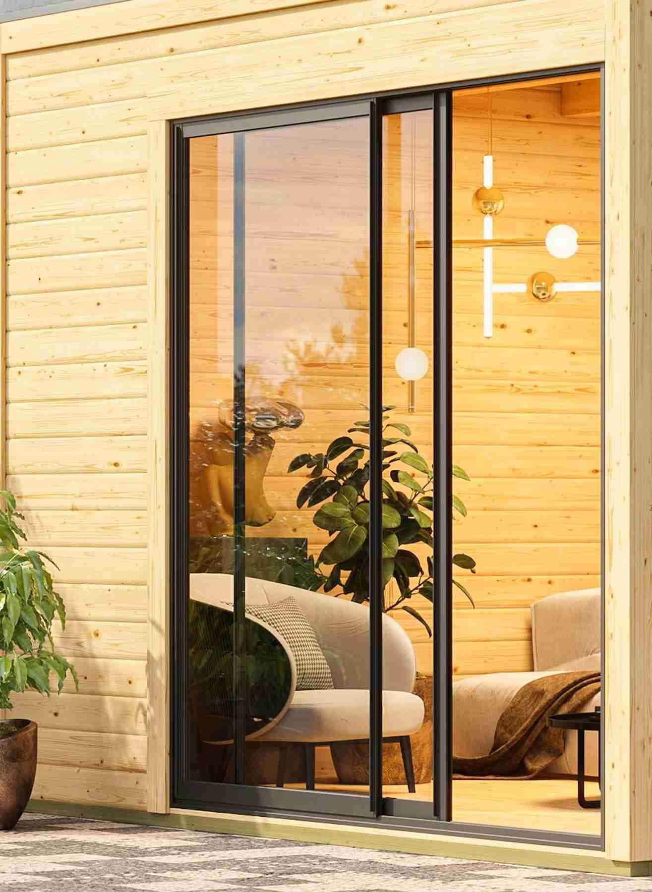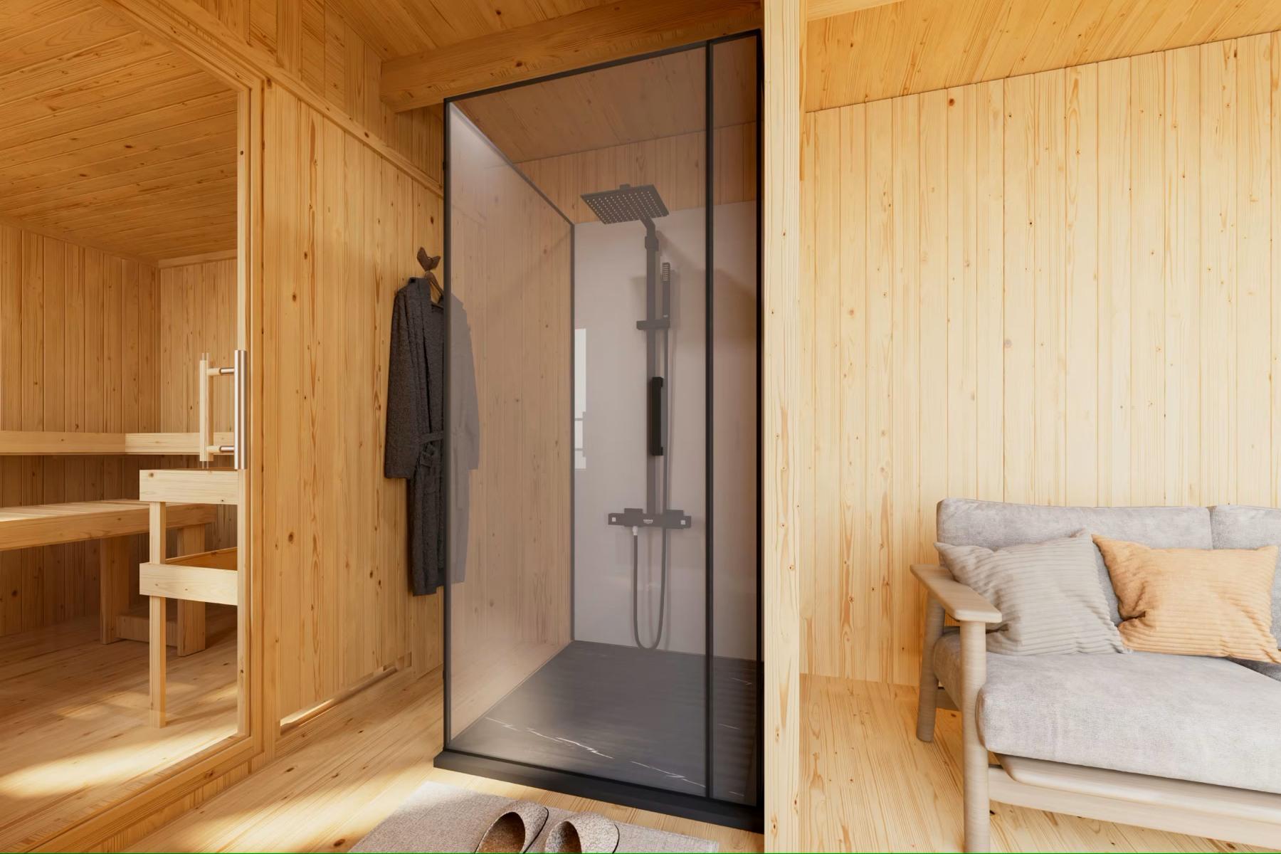 Tato luxusní venkovní sauna o rozměrech š 574 x h 217 cm přináší sofistikovaný wellness zážitek přímo do vaší zahrady. Díky 73 mm silným, minerální vlnou izolovaným stěnám, modernímu designu s plochou střechou a hliníkovými posuvnými dveřmi nabízí nejen výjimečné tepelně-izolační vlastnosti, ale i stylový vzhled. Interiér zahrnuje saunu s třemi pohodlnými lehátky z osiky, která pojme až 5 sedících osob, prostornou předsíň, kterou lze využít jako šatnu, relaxační zónu nebo úložný prostor, a dokonce i integrovanou místnost pro sprchu či toaletu. Velká okna z čirého skla zajišťují dostatek denního světla a propojení s přírodou, zatímco prosklené dveře mezi saunou a předsíní navozují vzdušnost a klid. Ideální pro každodenní relaxaci.