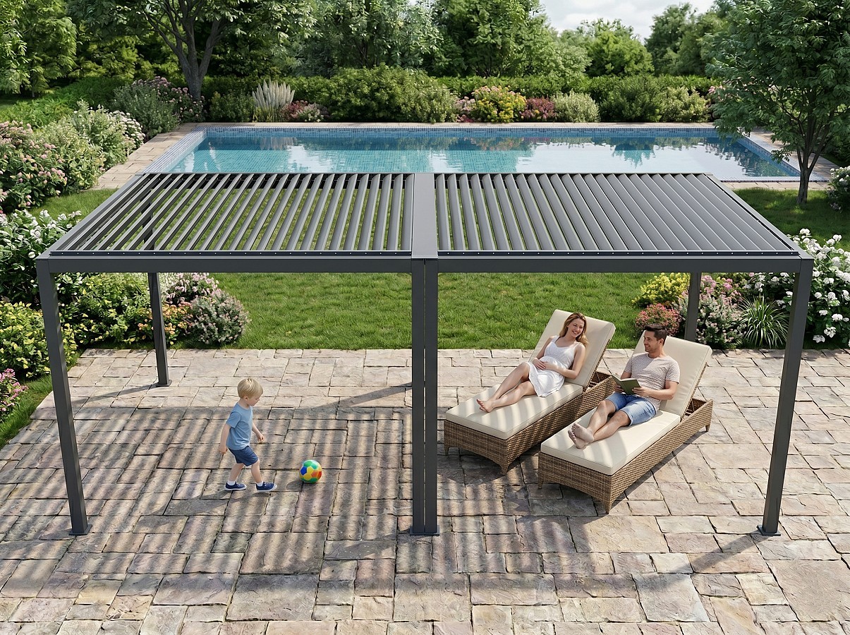 Volně stojící set dvou hliníkových bioklimatických pergol, š 5,76 x d 2,88 m x v 2,50 m, barva antracit, plochá manuálně ovládaná střecha, AL lamely.