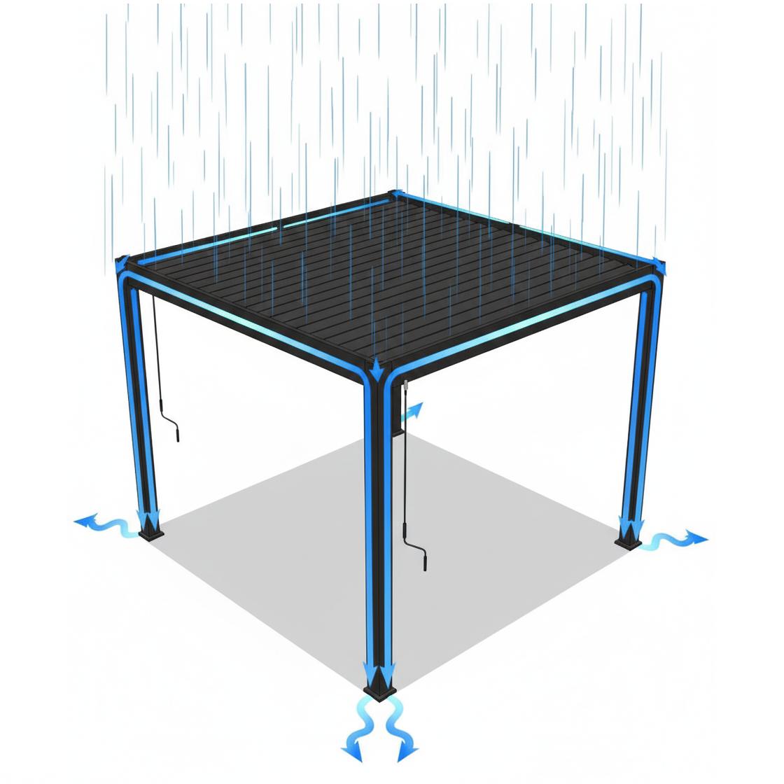 Primárním úkolem střešních lamel bioklimatické pergoly LANITPLAST PREMIUM je nastavení intenzity zastínění slunce, nicméně otočná střecha v zavřeném stavu zajistí i ochranu před deštěm. Při úplném uzavření střechy jsou totiž střešní lamely do sebe vzájemně zaklesnuty (systém pero drážka). Odvod vody je řešen jedinečným drenážním systémem integrovaným přímo do konstrukce. V zimním období je nutné ponechat lamely ve svislé otevřené poloze, jinak by mohlo dojít k jejich poškození. Při správném ukotvení a otevřené střeše pergola odolá větru až do stupně 12 Beaufortovy stupnice (hurikán).