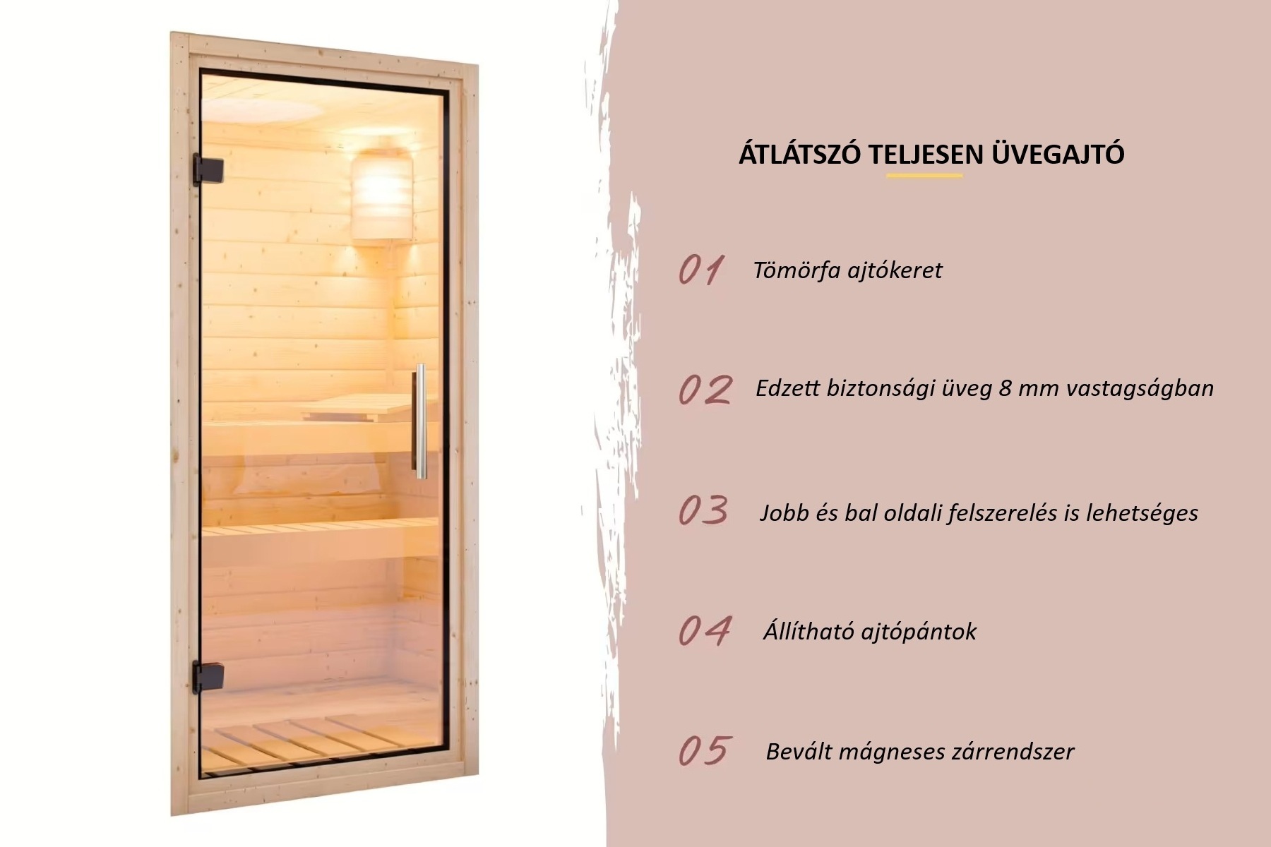 - ajtó: átlátszó biztonsági üveg 8 mm vastag, mérete 64 x 173 cm