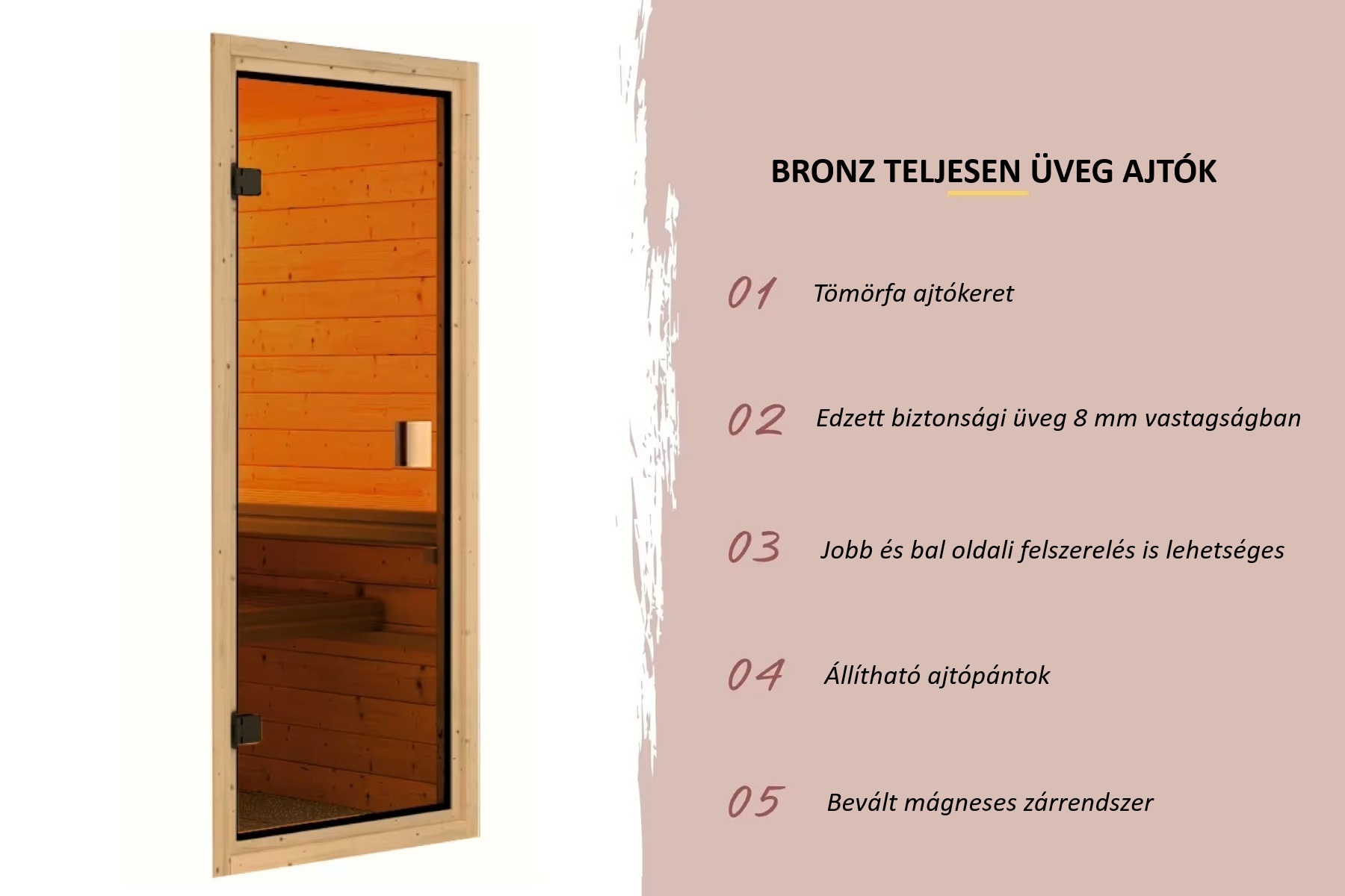 - ajtó: füstbarna biztonsági üveg, 8 mm vastag, méretek 81 x 180 cm