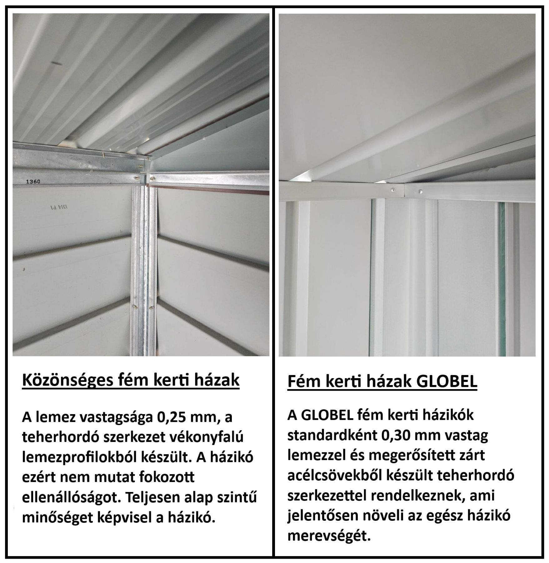 Minden GLOBEL kertes ház szabványosan 0,30 mm-es megnövelt lemezvastagsággal rendelkezik, és a tartószerkezet megerősített zárt acélcsövekből készült (a cseh és szlovák piacon elterjedt házak tartószerkezete csak vékonyfalú acélprofilokból áll). Ez biztosítja az egész kerti ház maximális tartósságát és stabilitását. Az erős acéllemezek és a masszív tartószerkezet használatát a kertes ház viszonylag nagyobb súlya is alátámasztja a méretben azonos versenytársakhoz képest. A GLOBEL kerti házak ezért lényegesen robusztusabbak és 20%-kal nehezebbek, mint a más márkájú kerti házak.