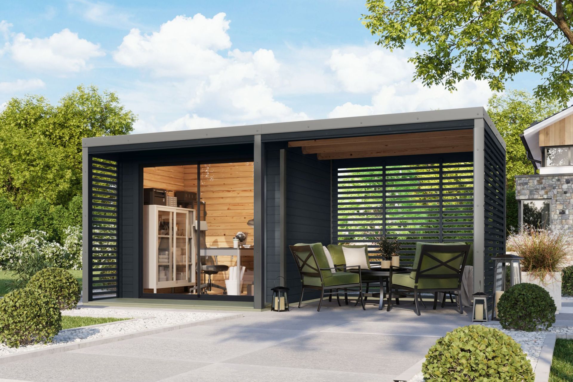 hybridní domek KARIBU SATURN (50568) antracit / šedý + 253 cm přístavek včetně zadní a boční stěny