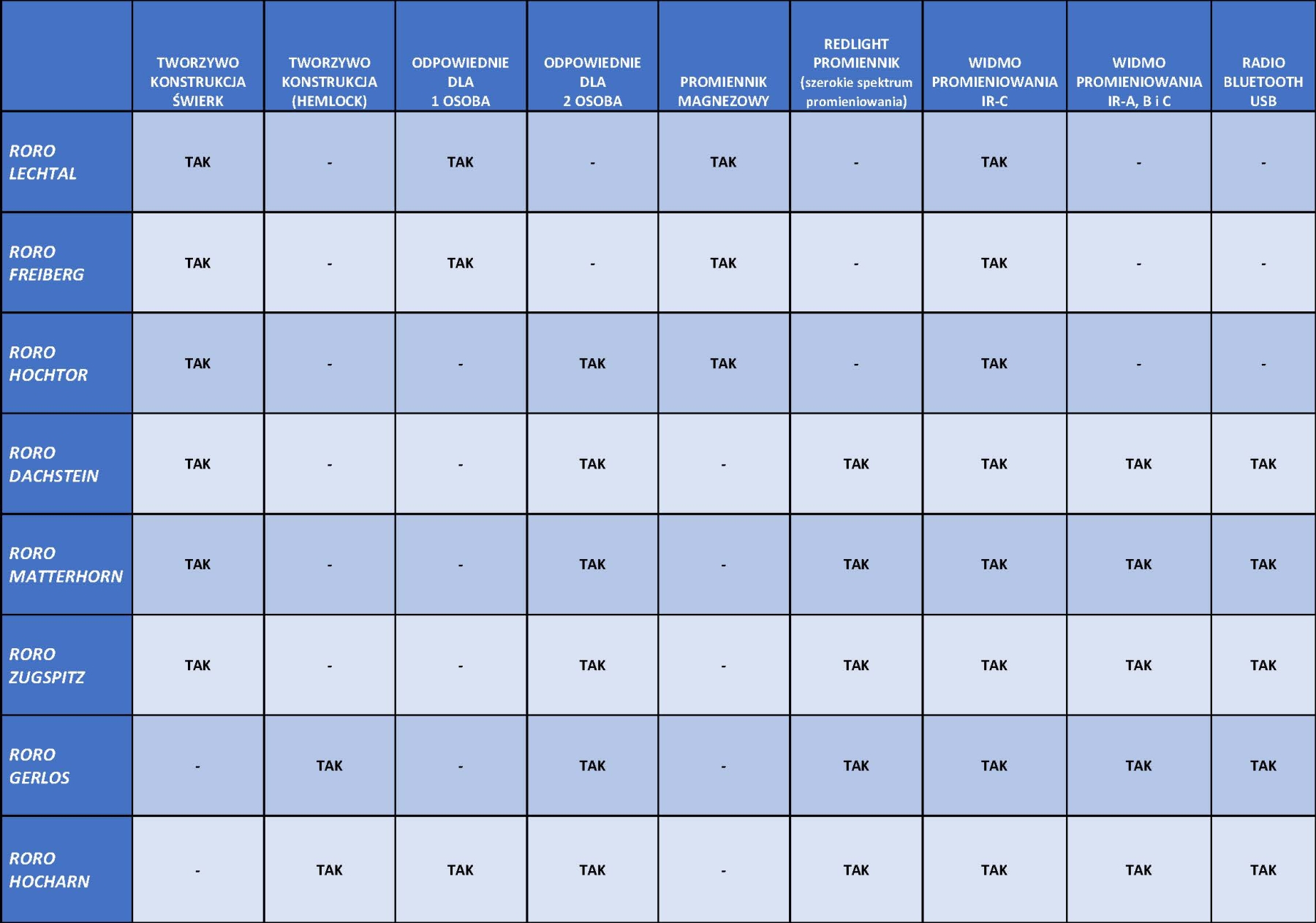 | Widmo promieniowania | IR-C, częściowo IR-B | IR-A, IR-B, IR-C |