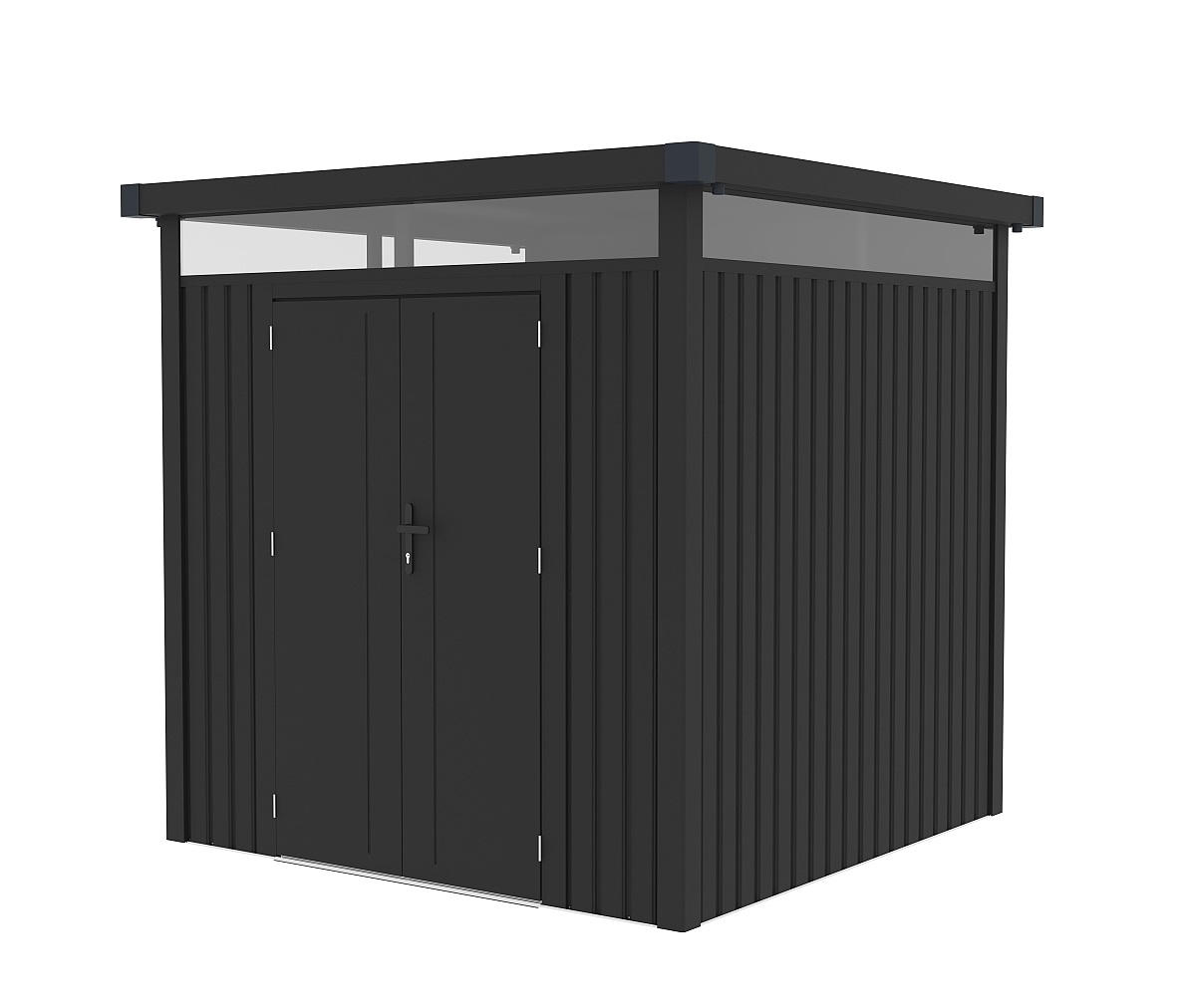 Tato praktická konstrukce váží 174 kg a má antracitovou barvu, která se snadno začlení do každého venkovního prostředí. Plochá střecha a dvojité křídlové dveře o rozměrech š 106 x v 178 cm dodávají domku jednoduchý a moderní vzhled.