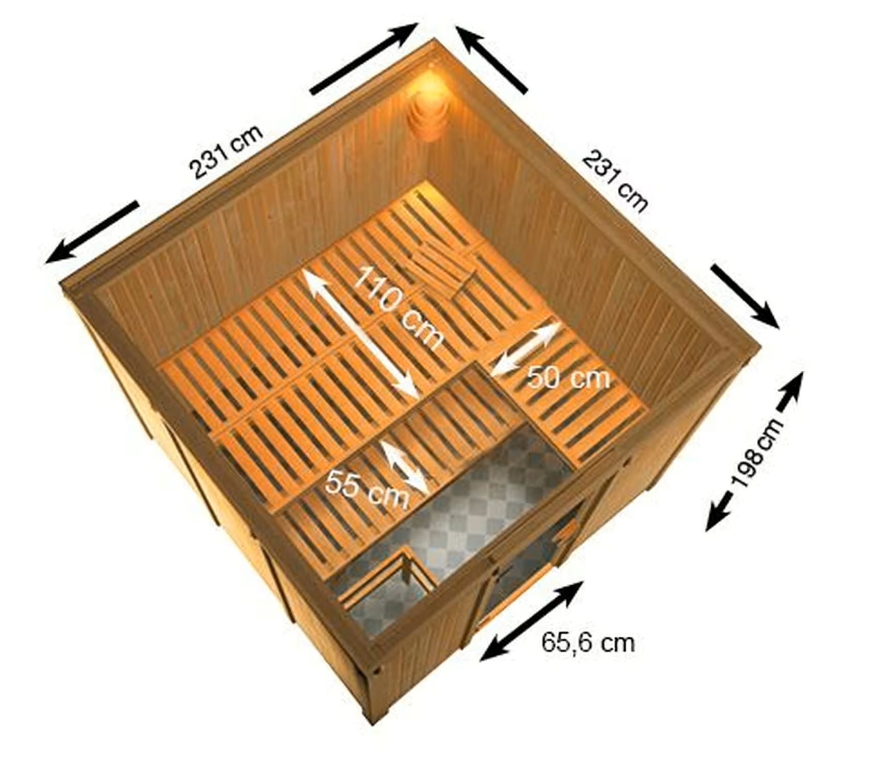 Fínska sauna určená pre tri ležiace osoby. Má rozmery š 231 x h 231 x v 198 cm. Tento model fínskej sauny je určený do temperovaných interiérov domu alebo bytu. Jej výrobca, firma KARIBU HOLZTECHNIK z nemeckých Brém, dokázala svojimi výrobkami úspešne nadviazať na stáročnú tradíciu škandinávskeho saunovania a súčasne do nej zapracovať dnešné moderné technológie. Sauna je celá vyrobená z dreva severského smreka v prírodnom prevedení. Drevo pochádza zo vzdialeného severu Európy a je chemicky úplne neošetrené (nie je ani namorené ani nalakované). V dôsledku toho je prosté všetkých známych problematických látok, ktoré by sa v priebehu saunovania mohli z dreva uvoľňovať. Táto interiérová sauna vykazuje mimoriadne tepelno-izolačné vlastnosti. Steny sauny sú zložené z vnútornej a vonkajšej vrstvy špeciálne hladených dosiek s perom a drážkou, medzi ktorými je 42 mm hrubá tepelná izolácia v podobe minerálnej vlny. Celková hrúbka steny je tak 68 mm. Zadné alebo bočné nepohľadové strany orientované k stene miestnosti majú vonkajšiu stranu zo sololitu. Preto sú pri rovnakej tepelnej izolácii o cca 10 mm tenšie ako pohľadové strany pokryté palubovkami.