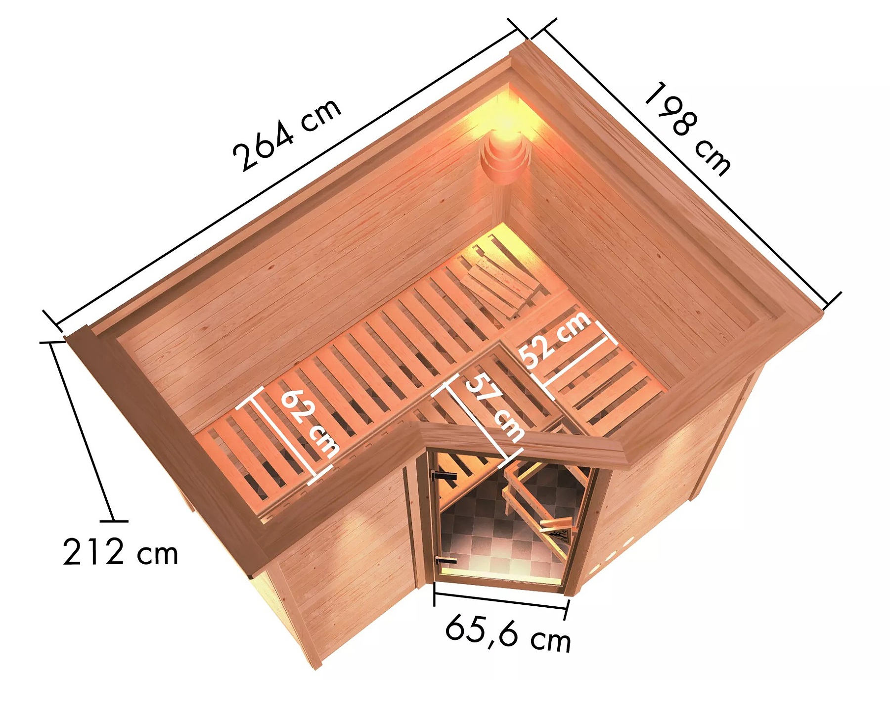 Fínska sauna určená pre tri ležiace osoby. Má rozmer š 264 x h 198 x v 213 cm. Tento model fínskej sauny je určený do temperovaných interiérov domu alebo bytu. Jej výrobca, firma KARIBU HOLZTECHNIK z nemeckých Brém, dokázala svojimi výrobkami úspešne nadviazať na stáročnú tradíciu škandinávskeho saunovania a súčasne do nej zapracovať dnešné moderné technológie. Sauna je celá vyrobená z dreva severského smreka v prírodnom prevedení. Drevo pochádza zo vzdialeného severu Európy a je chemicky úplne neošetrené (nie je ani namorené ani nalakované). V dôsledku toho je prosté všetkých známych problematických látok, ktoré by sa v priebehu saunovania mohli z dreva uvoľňovať. Táto interiérová sauna je vyrobená z masívneho dreva hrúbky 40 mm. Steny sauny sú zložené zo špeciálne hladených dosiek s dvojitým perom a drážkou, čo garantuje neobyčajnú pevnosť spoja.