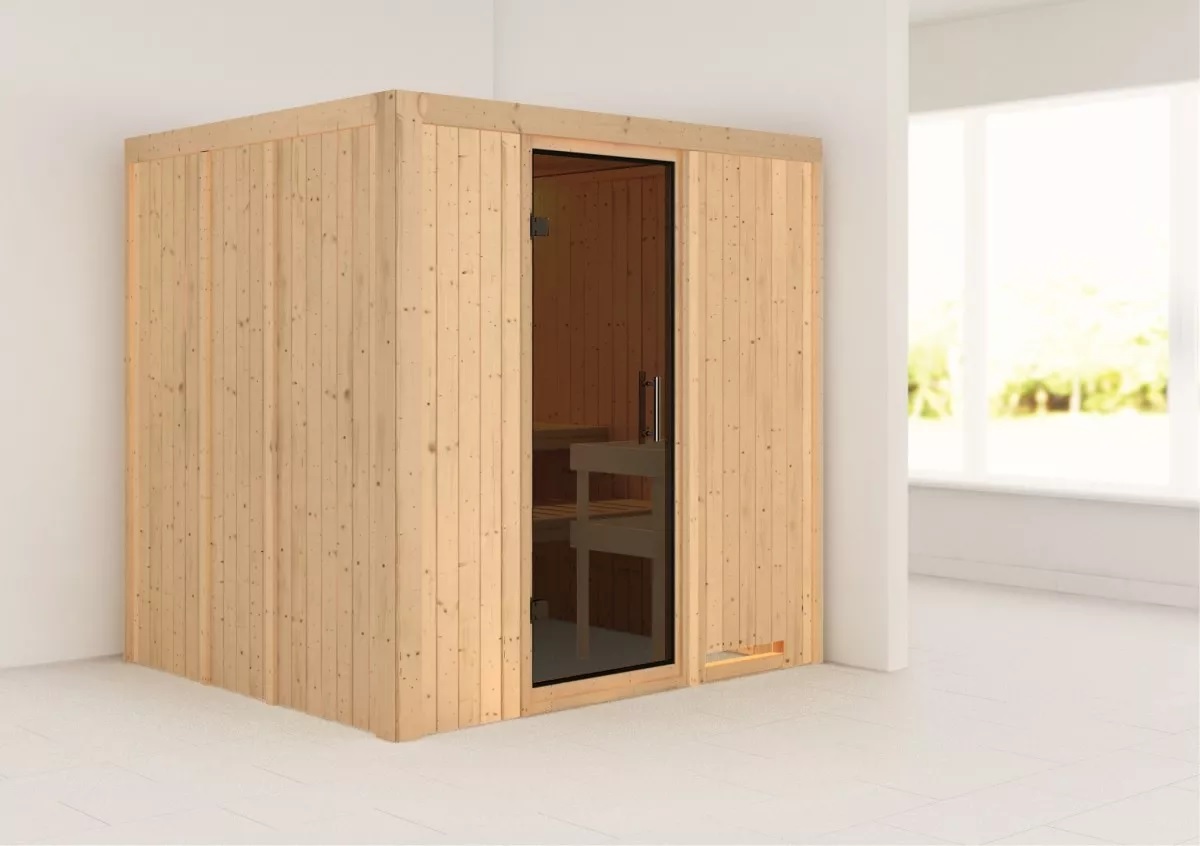 Tento model fínskej sauny je určený do temperovaných interiérov domu alebo bytu. Jej výrobca, firma KARIBU HOLZTECHNIK z nemeckých Brém, dokázala svojimi výrobkami úspešne nadviazať na stáročnú tradíciu škandinávskeho saunovania a súčasne do nej zapracovať dnešnú modernú technológiu. Fínska sauna určená pre dve osoby. Má obdĺžnikový tvar š 196 x h 170 x v 198 cm. Saunu dodávame bez dodatočného dreveného profilu pri strope a bez LED osvetlenia. Sauna je celá vyrobená z dreva severského smreku. Drevo pochádza zo vzdialeného severu Európy a je chemicky úplne neošetrené (nie je ani namorené ani nalakované). V dôsledku toho je prosté všetkých známych problematických látok, ktoré by sa v priebehu saunovania mohli z dreva uvoľňovať. Táto interiérová sauna vykazuje mimoriadne tepelnoizolačné vlastnosti. Steny sauny sú zložené z vnútornej a vonkajšej vrstvy špeciálne hladených dosiek s perom a drážkou, medzi ktorými je 42 mm hrubá tepelná izolácia v podobe minerálnej vlny. Celková hrúbka steny je tak 68 mm. Zadná alebo bočná nepohľadová strana orientovaná k stene miestnosti majú vonkajšiu stranu zo sololitu. Preto sú pri rovnakej tepelnej izolácii o cca 10 mm tenší ako pohľadové strany pokryté palubovkami s perom a drážkou.