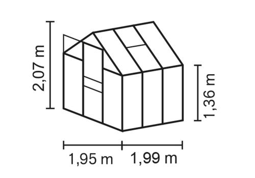 Hliníkový skleník, š 1,95 x d 1,99 m, strieborná farba, 1x str. okno, polykarbonát 4 mm, základňa v cene, plocha 3,88 m2.