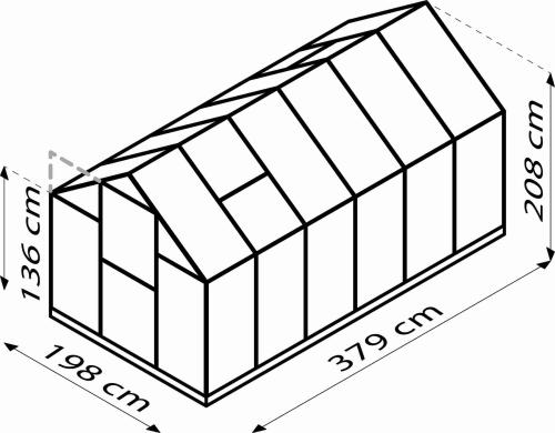 Hliníkový skleník, š 1,98 x d 3,79 m, čierny, 2x str. okno, polykarbonát 4 mm, dvere na pántoch, plocha 7,50 m2.