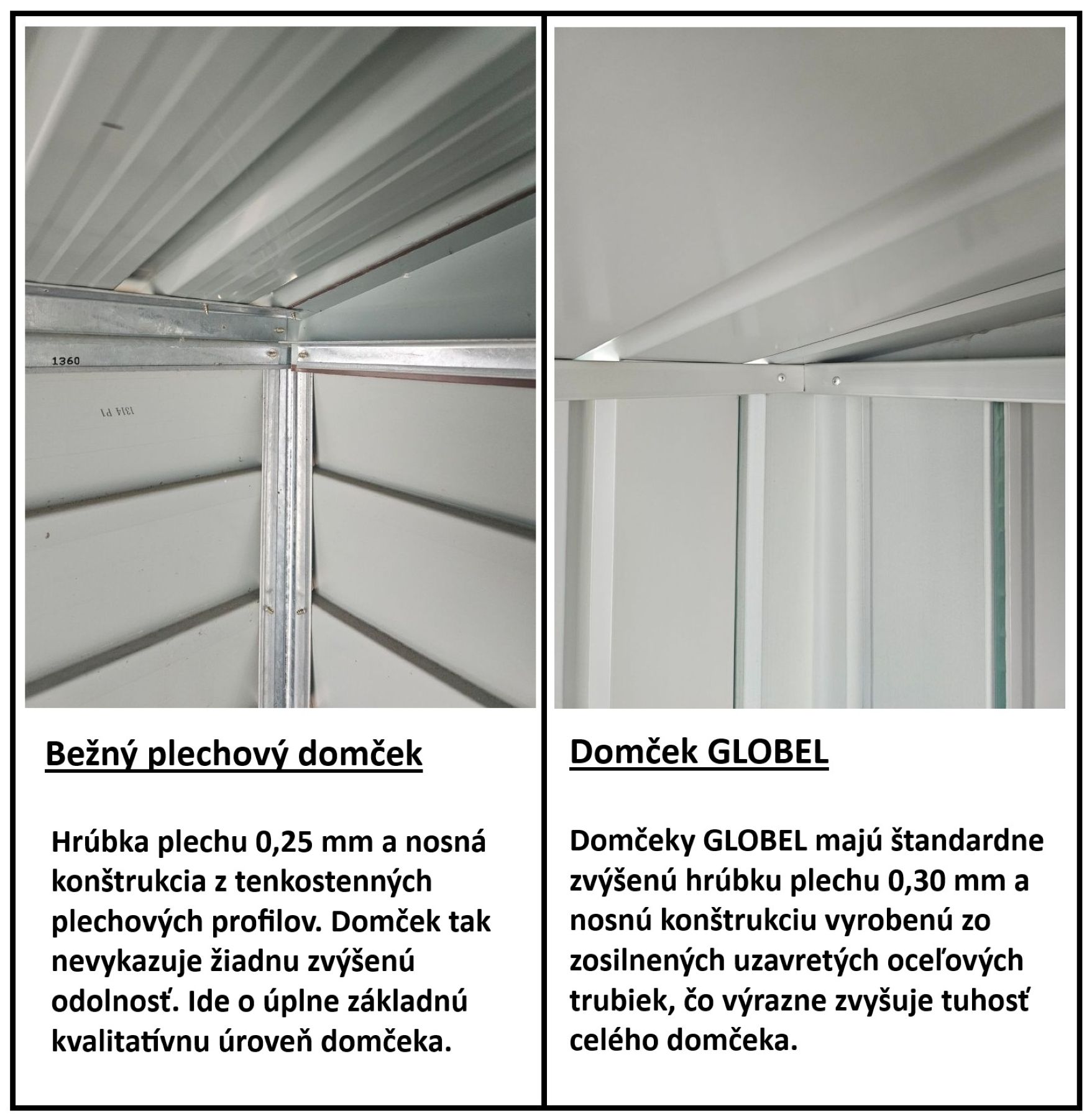 Všetky domy GLOBEL majú štandardne zvýšenú hrúbku plechu 0,30 mm a nosný rám je vyrobený zo zosilnených uzavretých oceľových trubiek (bežné domčeky na českom a slovenskom trhu majú nosný rám len z tenkostenných oceľových profilov). Tým sa zabezpečí maximálna odolnosť a stabilita celého domčeku. Použitie hrubých oceľových plechov a masívnej nosnej konštrukcie potvrdzuje aj relatívne vyššia hmotnosť domu v porovnaní s rozmerovo rovnakými konkurentmi. Domčeky GLOBEL sú preto výrazne robustnejšie ako domčeky iných značiek a majú približne o 20 % vyššiu hmotnosť.