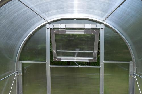 šířka 2,9 m, cca délky 4 / 6 / 8 m, masivní 1 mm silný a 65 mm široký eloxovaný hliníkový profil, rozteč oblouků 100 cm, vnitřní podpěry obloukové konstrukce, dvojité dveře vpředu, ventilační okno vzadu, prosklení nutno vyřezat z dodaných polykarbonátových desek |