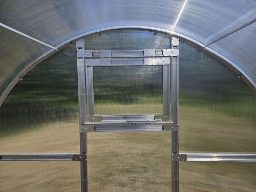 šířka 2,9 m, délky cca 4 / 6 / 8 m, masivní 1 mm silný a 65 mm široký eloxovaný hliníkový profil, rozteč oblouků 100 cm, vnitřní podpěry obloukové konstrukce, dvojité dveře vpředu, ventilační okno vzadu, prosklení nutno vyřezat z dodaných polykarbonátových desek |