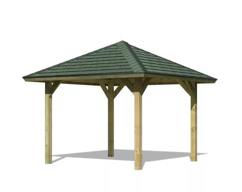 Pavilon má základní čtvercový tvar a díky vnitřnímu rozměru 2,47 x 2,47 m nabízí dostatek prostoru pro letní posezení, grilování, relaxaci i rodinnou oslavu. Celková zastřešená plocha je 3,40 x 3,40 m. Výška boku je 1,99 m a výška hřebene 2,9 m. Čtyři sloupky 11,5 x 11,5 cm podpírají střechu s masivními příčnými podpěrami. Konstrukce altánu je tlakově impregnována a je tak dobře chráněna proti dřevokazným houbám i hmyzu, ale i proti nepříznivým povětrnostním podmínkám. Impregnace je zdravotně nezávadná a naprosto bezpečná. Vzhledem k velkým plochám střechy a zatížení větrem je nutné připevnit altán k zemi pomocí odpovídajících H kotev v délce cca 60 cm (nejsou obsahem dodávky).