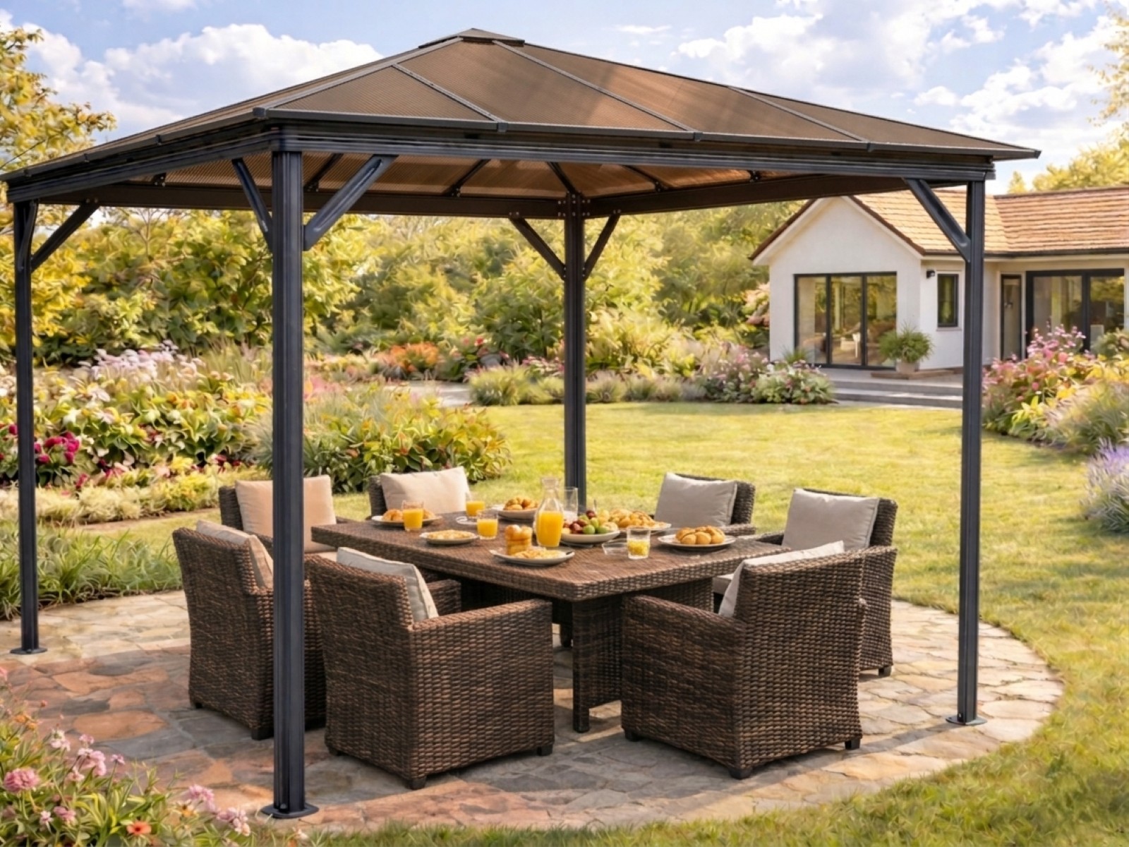 Hliníkový zahradní altán, rozměry 2,97 x 2,97 m, konstrukce barvy antracit, střecha - bronz komůrkový polykarbonát 6 mm.
