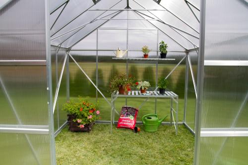 Obsahem balení jsou dvoukřídlé posuvné dveře (š x v otvoru = 1,22 x 1,91 m), AL profily, prosklení, 2x střešní ventilační okénko s manuálním otevíráním, veškerý spojovací materiál. Skleník lze postavit např. na zděnou podezdívku nebo na základnu z pozinkovaného plechu. Při stavbě bez podezdívky dokoupení základny doporučujeme. Ke skleníku je možné dokoupit řadu nadstandardního příslušenství - poličky, regály, další větrací střešní i boční okénka, automatické otvírače k těmto okénkům, okapové sady, teploměry, vlhkoměry, zavlažovací zařízení, elektrické odporové vytápění půdy.