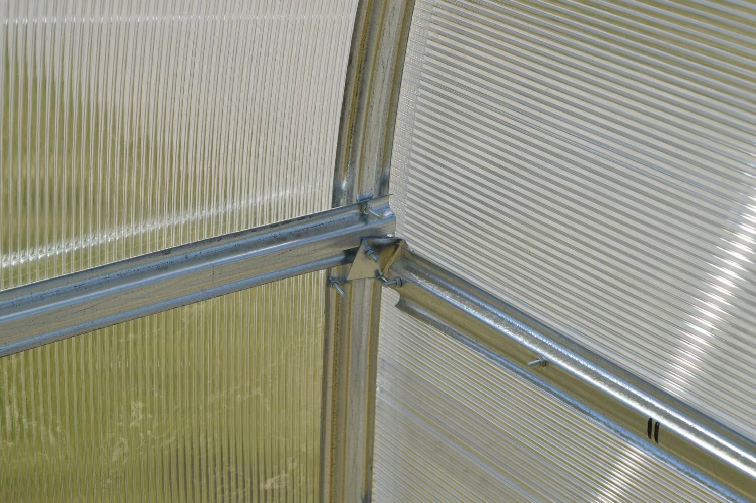 Konstrukce - konstrukce skleníku je sešroubovaná z pozinkovaných omega profilů síly 0,70 - 0,85 mm. Materiál profilů je galvanicky pozinkovaný. Jednotlivá žebra nosných oblouků jsou od sebe vzdálena pouhých 60 - 80 cm, což je velká výhoda tohoto modelu skleníku oproti jiným výrobkům na českém trhu. Malá rozteč oblouků 0,6 - 0,7 m garantuje vysokou únosnost celé konstrukce skleníku. Přední a zadní čela skleníku mají vestavěné dvojité dveře, takže skleníkem je možné procházet z obou stran. Pokud otevřete horní část dveří na obou koncích skleníku, zajistíte tím pohodlné větrání celého skleníku, aniž by do něj měly přístup děti nebo domácí zvířata. V případě, že nechcete montovat druhé dveře v zadní části skleníku, je možné do stěny umístit větrací okénko, do kterého lze namontovat automatický otvírač LANITPLAST (k zakoupení jako doplňkové příslušenství).