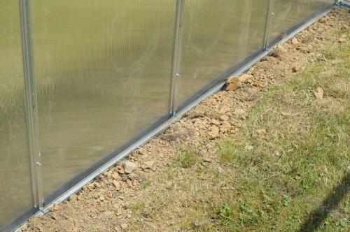 Skleník nepotřebuje žádnou podezdívku, protože konstrukce skleníku je připravena na zapuštění do země do hloubky cca 20 - 25 cm. Do děr v zemi se zasunou kotevní profily ve tvaru obráceného velkého písmene T, které se zabetonují. Skleník lze ukotvit i na dřevěnou / zděnou / betonovou podezdívku, vyžaduje to však drobné kutilské zásahy a především domácí vyrobení atypických plechových L úchytek pro přišroubování profilů k podezdívce (výrobce ukotvení skleníku na podezdívku nepředpokládá).